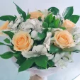 Букет выполнен из нежных кремовых роз, в дополнении кристально - белой альстромерии в окружении декоративной зелени, фетра в тон букету и розового банта.