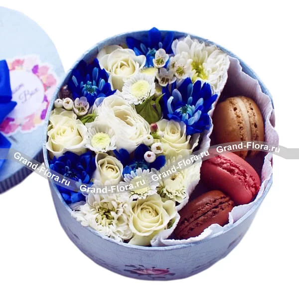 Коробочка удачи - коробка с розами, хризантемами и макарунс