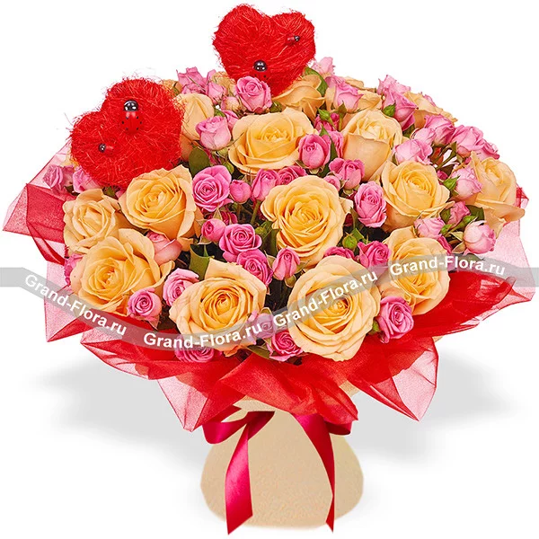 Стандартный: роза кремовая - 11 шт., розовая кустовая роза - 6 шт., декор, упаковка, лента.