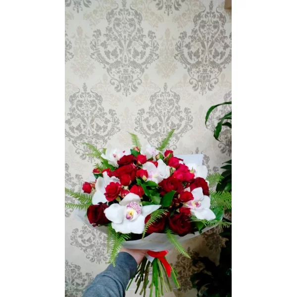 Стандартный: орхидея - 3 шт., роза красная - 5 шт., роза кустовая красная - 3 шт., декоративная зелень, упаковка, лента.