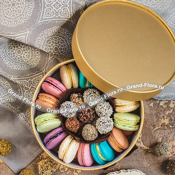 Стандартный: макаронс - 21 шт., трюфель - 20 шт., коробка.